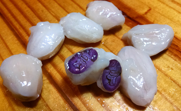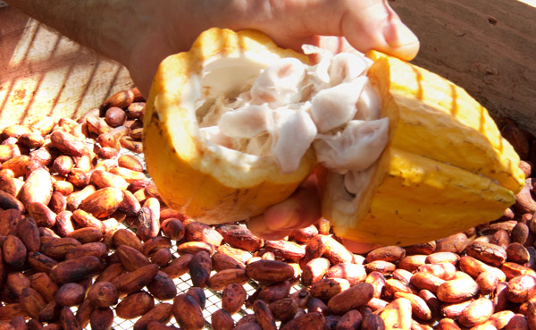 The white you see here is the sweet fruit covering of the Chocolate nut, which is typically eliminated. The inside of most varieties of Cacao is purple, but some are white. After drying they all turn brown.